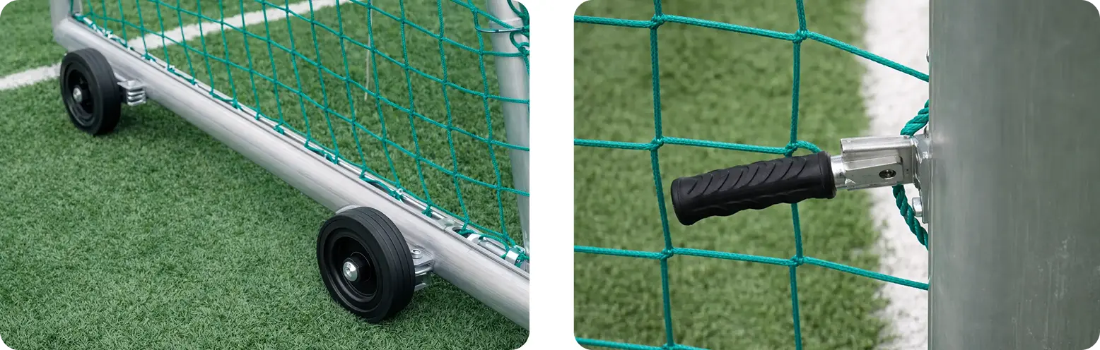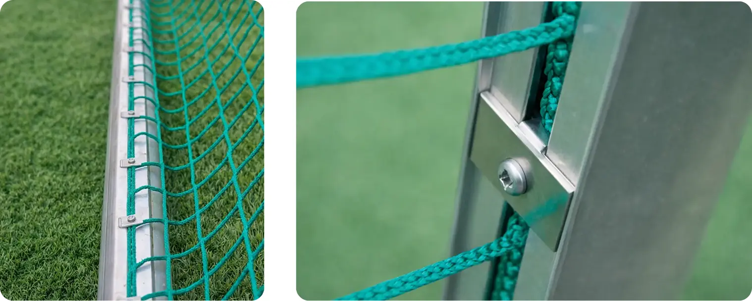 Nettene skrus ned i profilen med torx og ligger i ett med kanten – de bygger ikke ut og sitter trygt. Ekstra nettinnfesting ved hjørnene gjør at nettene blir helt tette. Ingen løse tau, ingen nett som henger skjevt midt i en kamp.